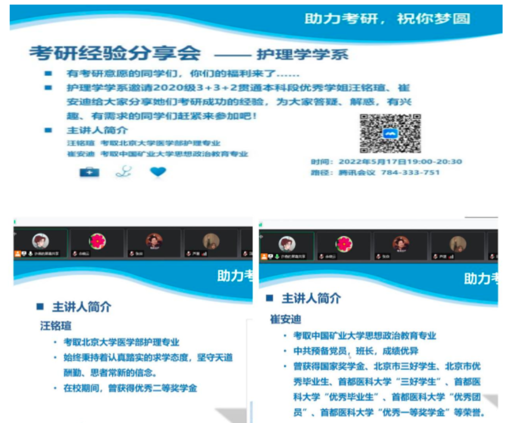 5月17日,护理学学系邀请了2020级护理“3+3+2”贯通本科段学生崔安迪、汪铭暄与学弟、学妹展开了一场精彩的考研经验分享会。