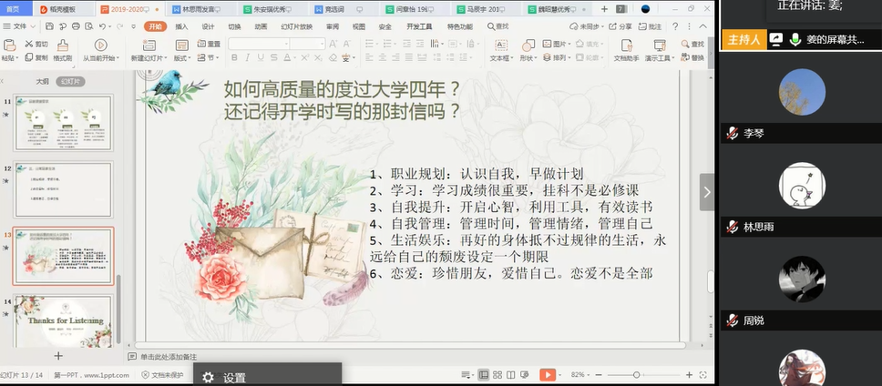 在评优推选环节,六位学生候选人依次从思想政治建设、团支部建设、团学活动、志愿服务参与等方面进行答辩,大家详细介绍了自己在理论学习、社会工作和志愿服务等方面取得的成绩,充分展示了年轻学子朝气蓬勃的精神面貌。随后通过线上民主评议的方式,选出了学系年度优秀团干部。在教学总结环节,学系辅导员姜佳铃老师做题为“兢兢业业心思,潇潇洒洒趣味”的学系工作总结,提出了疫情防控期间同学们居家学习和生活的建议,嘱咐大家提高自主学习的主动性,珍惜每一寸时光。