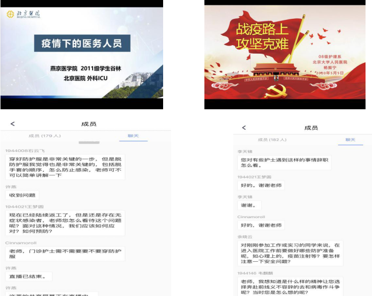 会上院长杨红代表学院领导讲话,对护理学学系的工作作出高度评价,同时对国际护士节表达美好祝福,寄许全院师生共同努力,不断提升专业知识和能力水平,为我们热爱的事业努力奋斗。最美逆行者、优秀护理毕业生谷林和杨振宁分别做了“疫情下的医务人员”和“战疫路上,攻坚克难”的精彩报告,分享了抗疫一线工作的艰辛,个人内心的成长历程以及思想上的巨大转变,激发了同学们的热情,给同学们树立了学习的榜样,同学们纷纷在讨论区留言,与两位学姐积极互动。