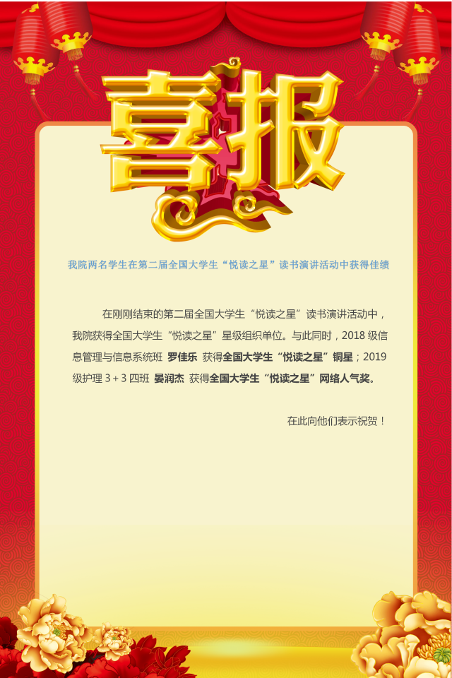 喜报——祝贺我院两名学生在第二届全国大学生“悦读之星”读书演讲活动中获得佳绩