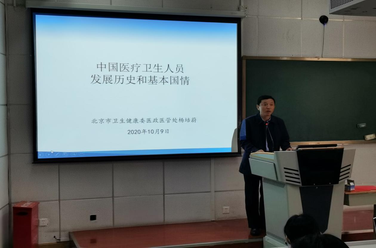 10月9日,北京市卫生健康委医政医管处杨培蔚处长应邀来我院为临床医学学系师生们带来了医学导论第四次专家课——以“中国医疗卫生人员发展历史和基本国情”为主题的专题讲座。杨培蔚处长现场诠释了相关专业的未来工作环境和行业发展趋势,让同学们明确了自己未来的职业规划并坚定了医学学习的信念。