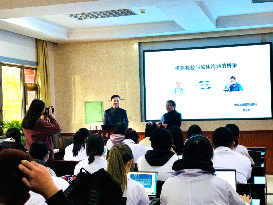 就如何建立检验与临床的沟通平台,曹主任总结了中日友好医院所建立的各种沟通机制,以及这些沟通机制为检验科带来的提升效应。最后,曹主任号召同学们,在大学学习、生活中,不仅要学好医学检验专业知识,还要注重临床知识的理解掌握,同时还要培养自身的沟通协调能力、语言表达能力等综合素质,使自己成长为一名高素质的医学检验技术人才。