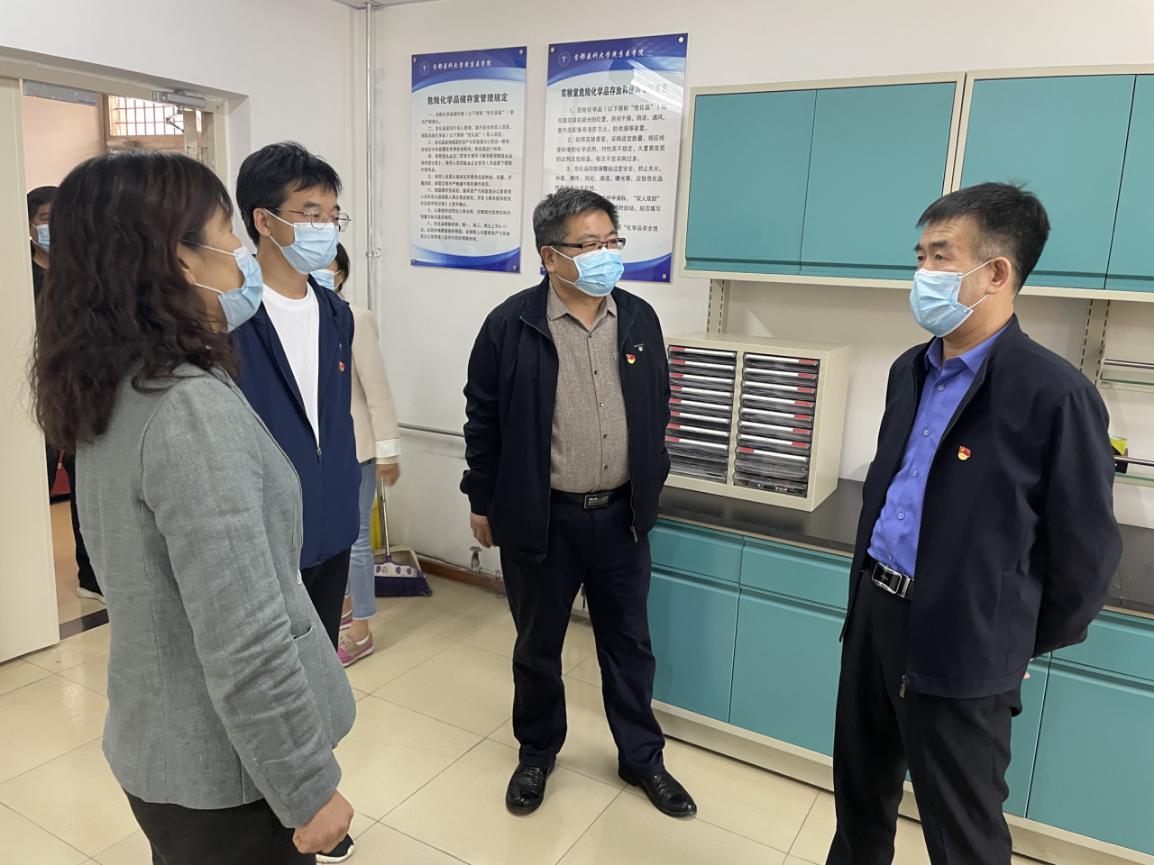 吴兵副校长一行先后来到学院危化品库房、中心实验室、校医院楼宇改造施工现场等区域进行实地检查。