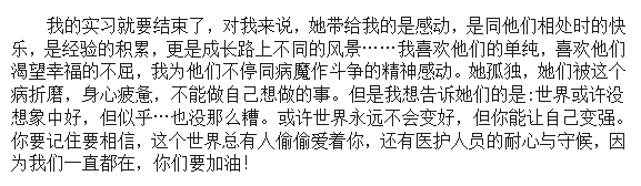 同学们书写的平行病历,分别从不同的视角,通过生动、形象的文字描述,记录、展示了他们在医院实习中的所见、所闻、所感,书写内容着重体现了叙事医学的核心——“共情和反思”。同学们在经历了实习后,重新回顾那些让自己对护理事业深刻反思的瞬间,或感动,或激励,他们以平行病历的形式展现了出来,叙述了当时的感受与想法,在自己反思的同时,也深深感染了身边同学。这些带有情感温度和人文关怀的真实事例,指引着同学们在护理事业的道路上更好地履行白衣天使的责任与使命,努力在自己的岗位上发光发热。