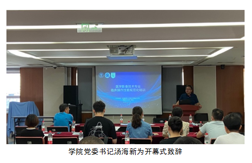 汤海新书记对前来参与培训的各位领导、专家、授课及带教老师表示感谢。他指出,我校医学影像技术专业第一次组织毕业实习,在这个背景下举办本次培训,旨在使各个基地都能以专业标准化的要求组织实习,最终培养出满足社会需求的高素质应用型医学影像技术合格人才。