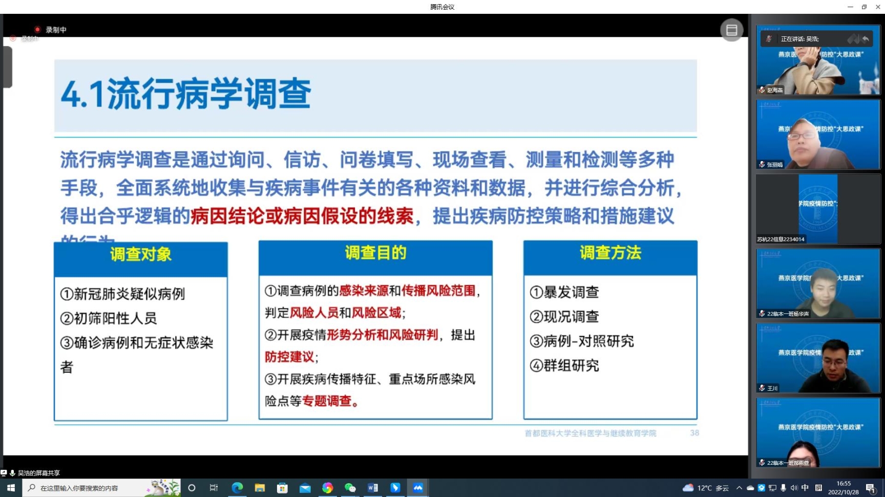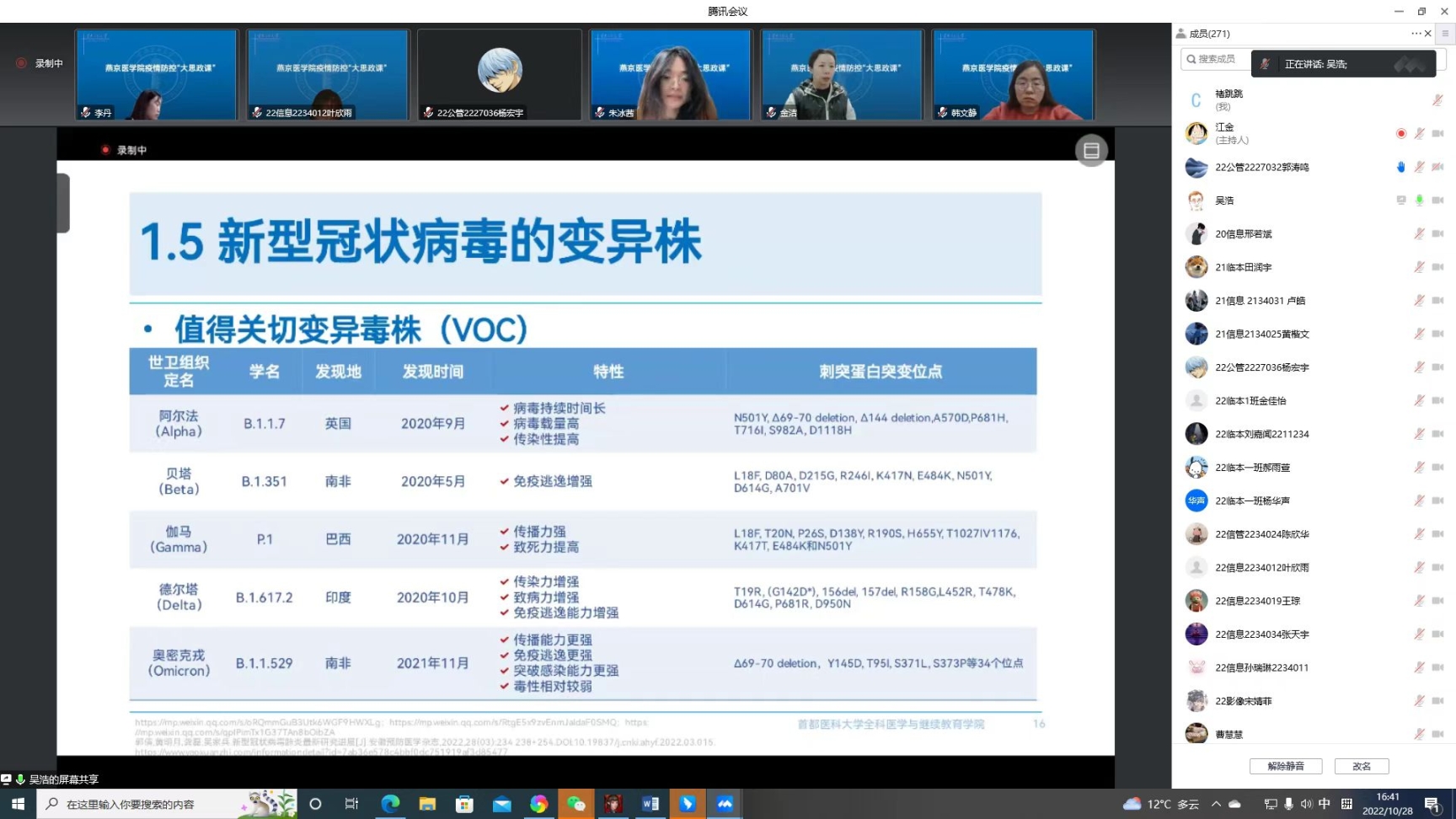 为进一步做好疫情防护宣传教育工作,引导广大师生充分理解和支持各项防疫政策,坚定战“疫”必胜的信心,10月28日,我院邀请全国政协委员、学校全科医学与继续教育学院院长吴浩教授通过腾讯会议为全院师生讲授了有深度又有温度的疫情防控“大思政课”。学院领导班子成员、师生代表参加了此次学习。学院党委副书记赵艳芝主持讲座。