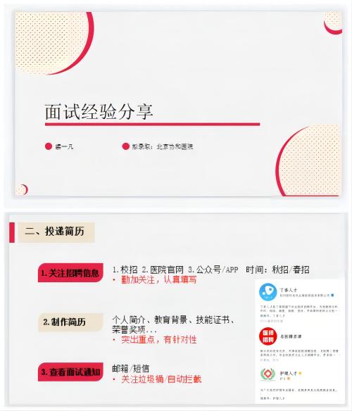 续一凡同学根据自己的求职经历,从医院选择、投递简历、面试技巧及注意事项四个方面详细展示了面试经验。