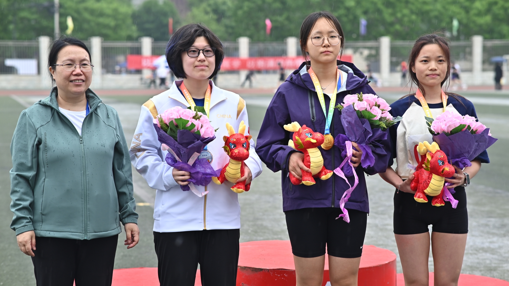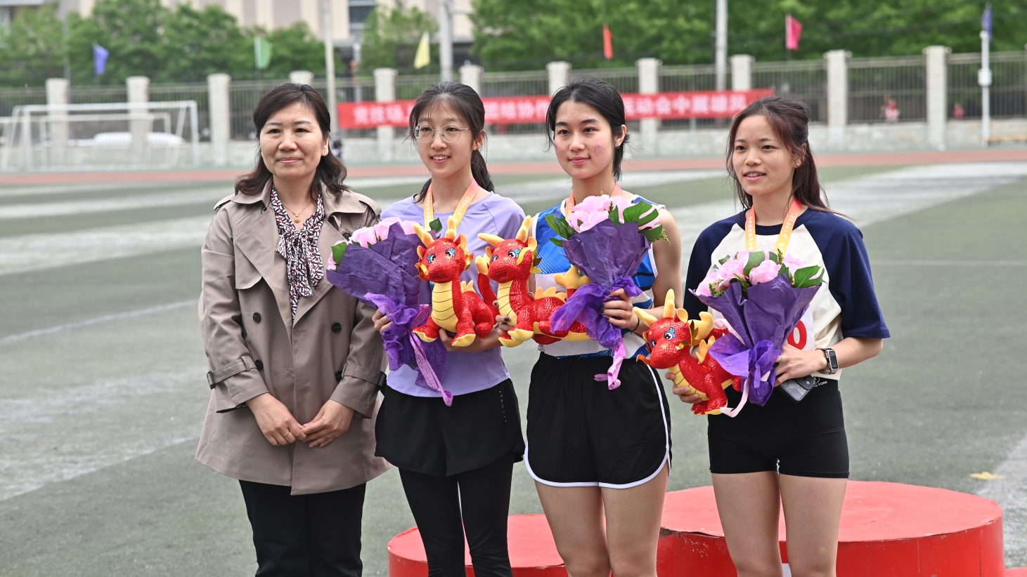 学院院长杨红、党委副书记赵艳芝亲赴比赛现场,亲切慰问学院田径队全体人员并致以诚挚祝贺,充分肯定了教练员、运动员们的昂扬斗志和拼搏精神,希望田径队继续发扬学院体育竞赛成绩优良的传统,助力学院体育水平的提升。赛后,两位领导为获奖运动员颁奖。