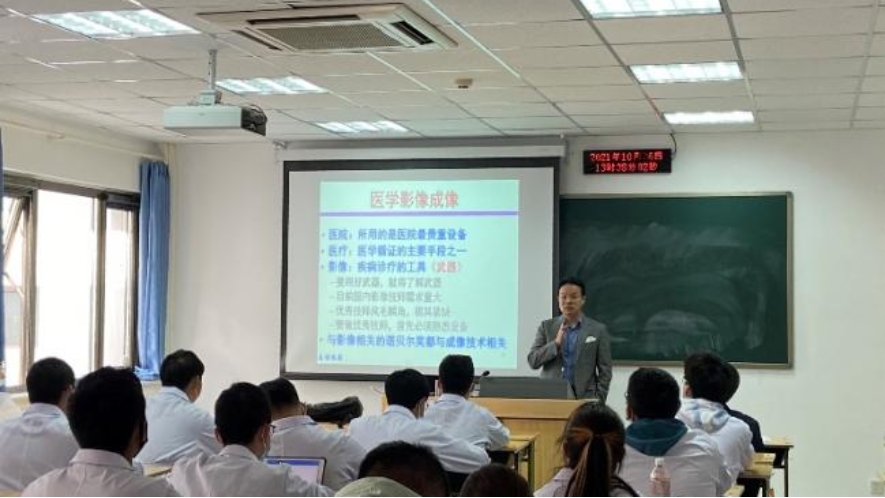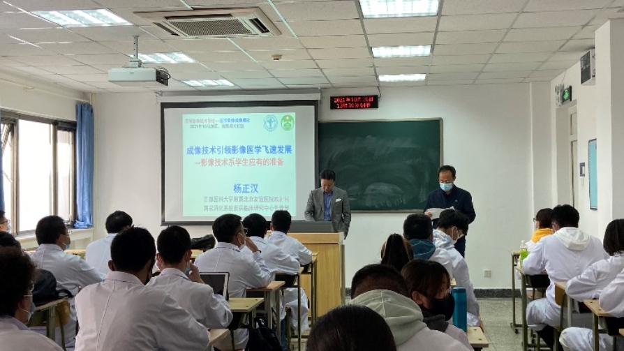 10月26日,哔咔漫画下载 附属北京友谊医院放射科主任杨正汉教授受邀来我院为2021级医学影像技术专业新生讲授专业导论课。院长杨红、学系副主任董建鑫及学系部分教师参加了此次活动。