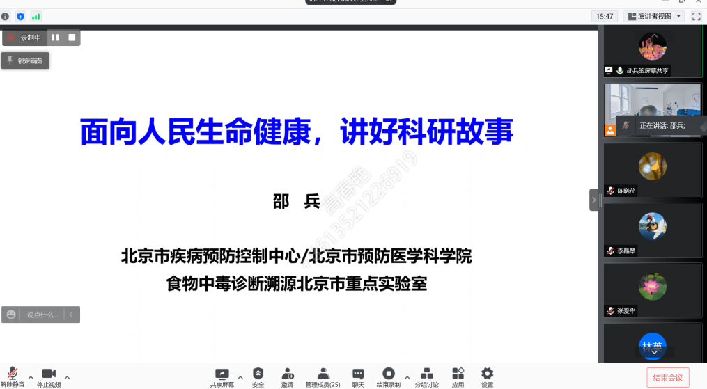 为促进学术研究,12月22日,检验学系邀请北京市疾病预防控制中心中心实验室、食物中毒诊断溯源北京市重点实验室、国家食品安全风险监测参比实验室主任邵兵教授在线上为我院教师们做了主题为“面向人民生命健康,讲好科研故事”的学术讲座。讲座由我院检验学系系主任高春艳主持,学院30多名教师相聚云端,认真聆听了邵兵教授的精彩讲座。