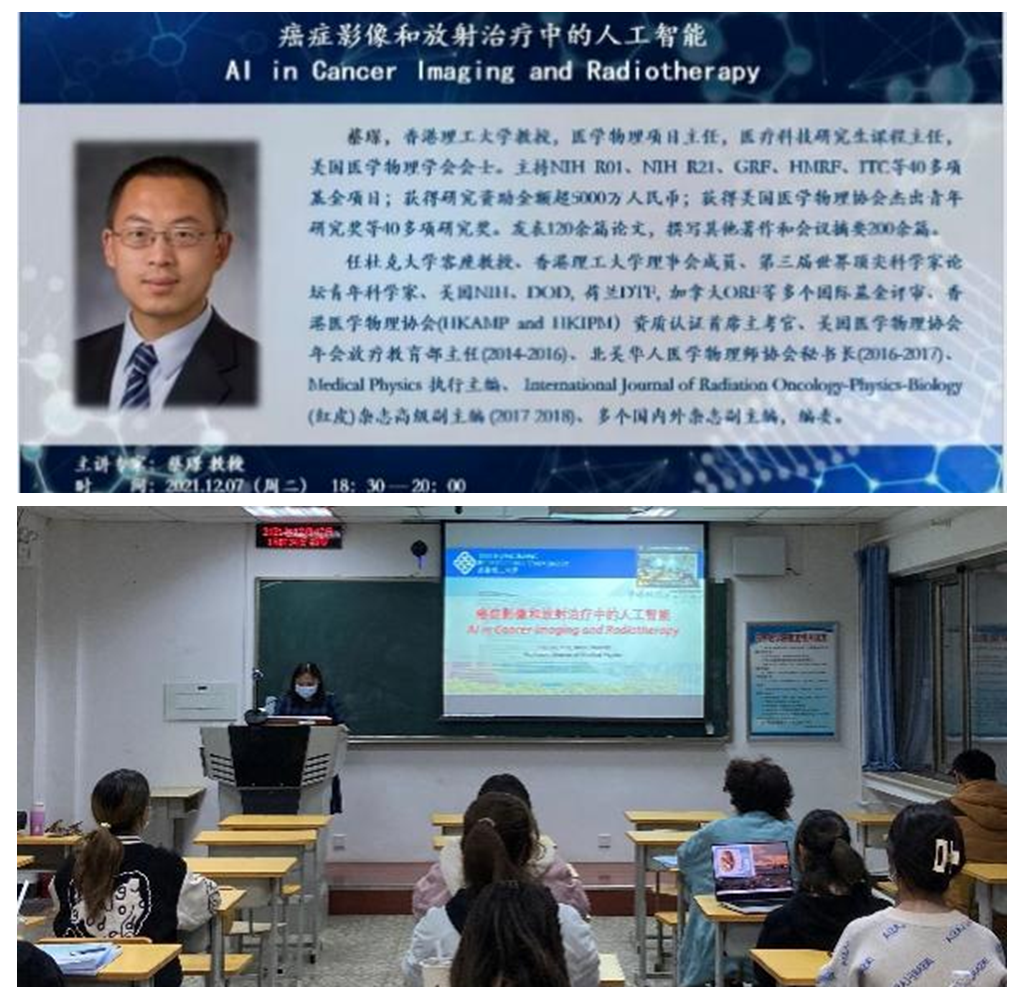 12月7日,医学影像学学系邀请知名学者、香港理工大学蔡璟教授,为学院师生带来题为“癌症影像和放射治疗中的人工智能”的线上讲座,这是医学影像技术学科系列讲座中的第一场。学系主任胡玲静主持本次讲座,副主任胡贵祥、学系部分教师及各年级同学代表参加此次讲座。