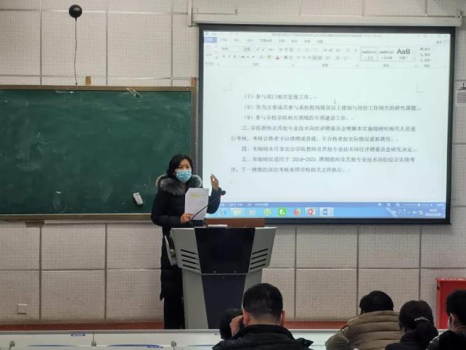 院长杨红对此次聘任考评工作的主要内容、流程、今年聘任考评工作的变化、目前工作的进度和安排进行了介绍,并对《实施细则》中的一些关键点作了详细解读。她指出,今年是十四五的开局之年,希望全体教职工以此次聘任为起点,结合学校“谋新局、开新篇”的总体布局,认真贯彻落实十九届六中全会精神,在未来的聘期中力争做出更多的实绩,为推动学校、学院的发展贡献更多的力量。