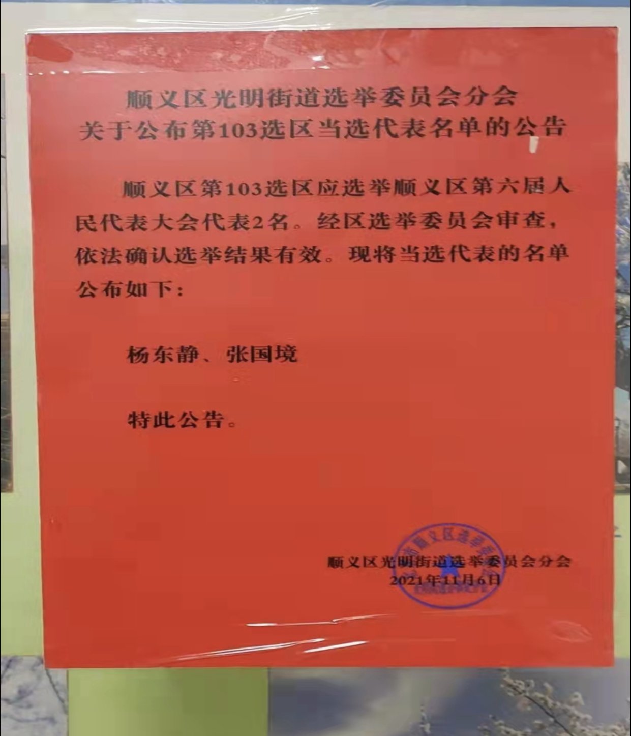 根据选举法和选举实施细则,学院选举工作组已将计票结果上报顺义区选举委员会审查确认,经顺义区选举委员会第5次会议审核确认,选区区人大代表选举结果有效并已公布。哔咔漫画下载 作为顺义区光明街道选举分会103选区选举工作圆满完成。
