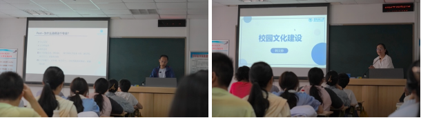 韩文静从班级、学系、学院、学校四个层次向新生们介绍了校园文化建设,充分展示了丰富多彩的校园活动,她鼓励新生们积极参加校园丰富课余生活的同时,提高个人综合素质水平。