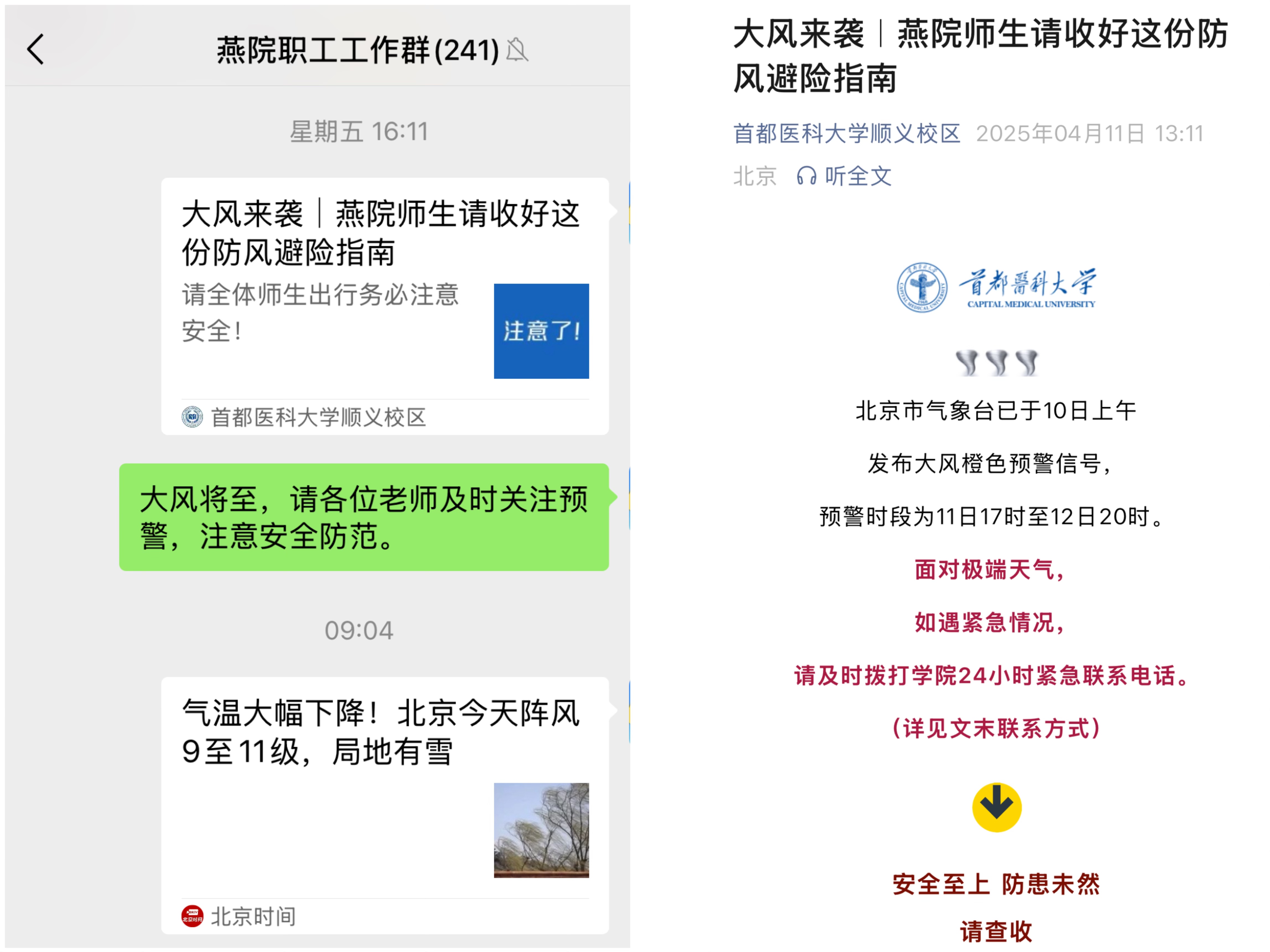 学院通过官方微信公众号、师生联络群等多渠道联动机制,第一时间向全院师生精准推送气象部门发布的预警信息,提醒师生在大风等极端天气条件下及时关好门窗,增强安全防范意识,建议非必要不外出,切实做好个人防护工作。