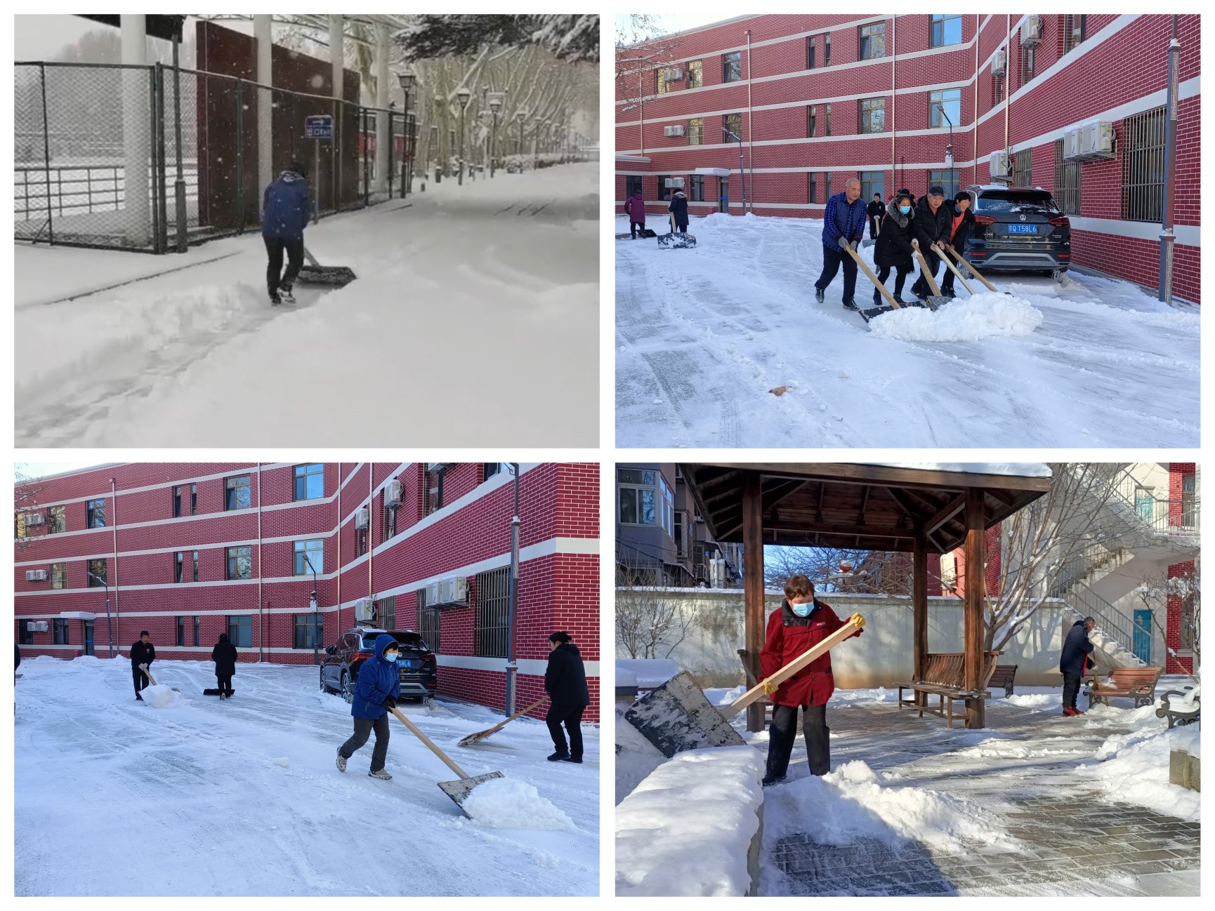 学院值班员工第一时间扫除道路及楼前积雪,全力做好校园扫雪、铲雪、防冻工作,保障道路畅通,防止各类安全事故发生。