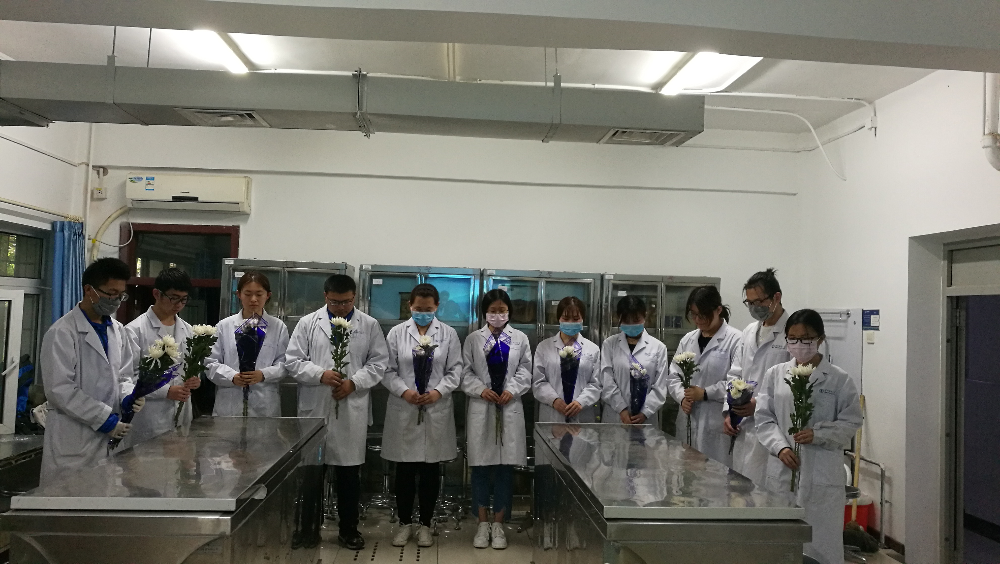 最后,师生为这些“无言的老师”献上圣洁的白菊花,共同默哀,在沉静、庄严的氛围中,大家追忆着“无言的老师”们,真诚地寄托哀思与敬意,更加坚定了同学们救死扶伤的信念和决心!