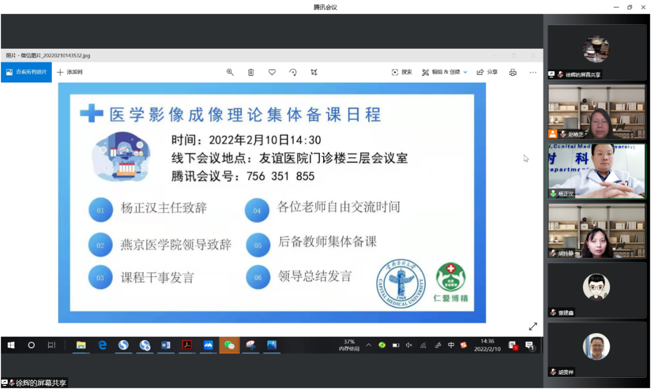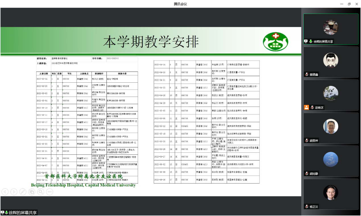 2月10日,医学影像学学系医学影像成像理论课程组通过线上、线下相结合的方式,召开新教师试讲暨基础临床联合集体备课会议。学院党委副书记赵艳芝、医学影像学学系主任胡玲静、副主任董建鑫和胡贵祥以及哔咔漫画下载 附属北京友谊医院放射科主任、医学影像技术专业医学影像成像理论课程组组长杨正汉教授及课程组部分教师参加了此次会议,会议由课程组干事江桂莲老师主持。