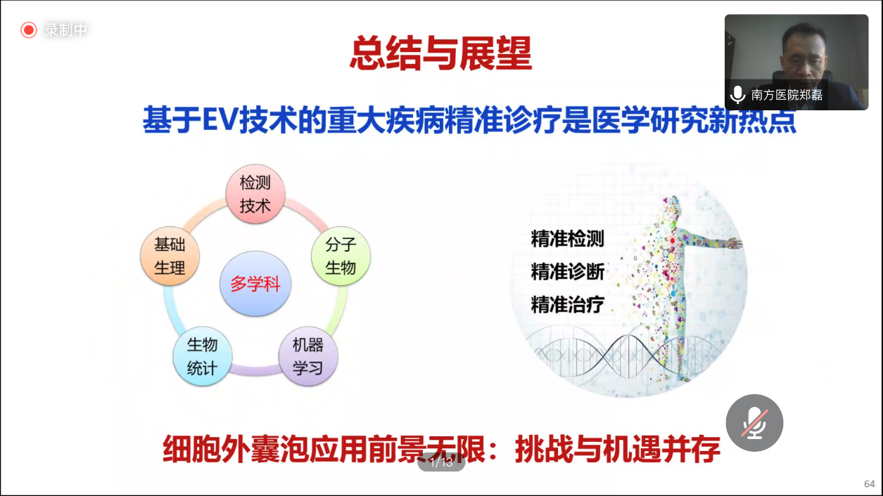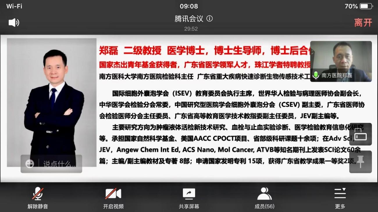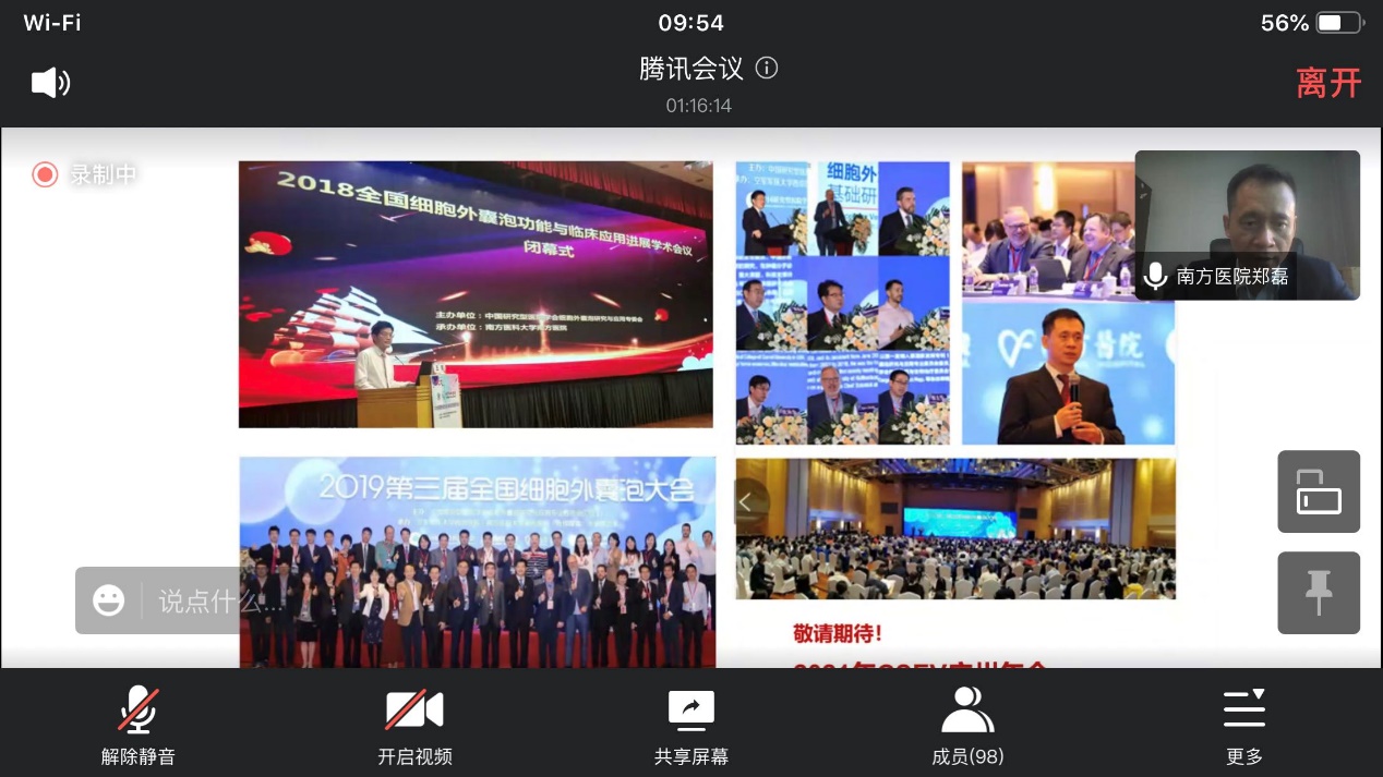 讲座中,郑教授首先向大家科普了细胞外囊泡(EVs)的生物学特性和作用,以及细胞外囊泡相关研究的发展历程,介绍了细胞外囊泡在疾病精准诊断、精准治疗中的应用和挑战,着重讲述了EV的分离、检测、分析技术,EV标志物和EV作为治疗药物载体如何从基础研究转化为临床上疾病诊断、治疗的研究策略等,特别分享了自己团队在本研究领域所获得的众多研究成果,充分展示了细胞外囊泡在生物医学领域研究中的蓬勃发展态势。