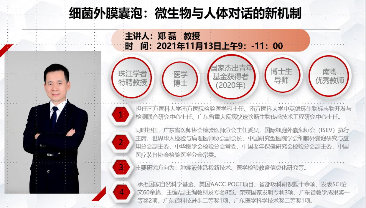 为促进一流专业建设,助力学术研究,11月13日,我院检验学学系邀请南方医科大学南方医院检验医学科主任、国家杰出青年基金获得者、珠江学者特聘教授、南粤优秀教师郑磊教授,为学院师生带来有关细胞外囊泡研究的学术讲座。学院院长杨红和100多名师生相聚云端,认真聆听了郑磊教授的精彩讲座,检验学学系主任高春艳主持。