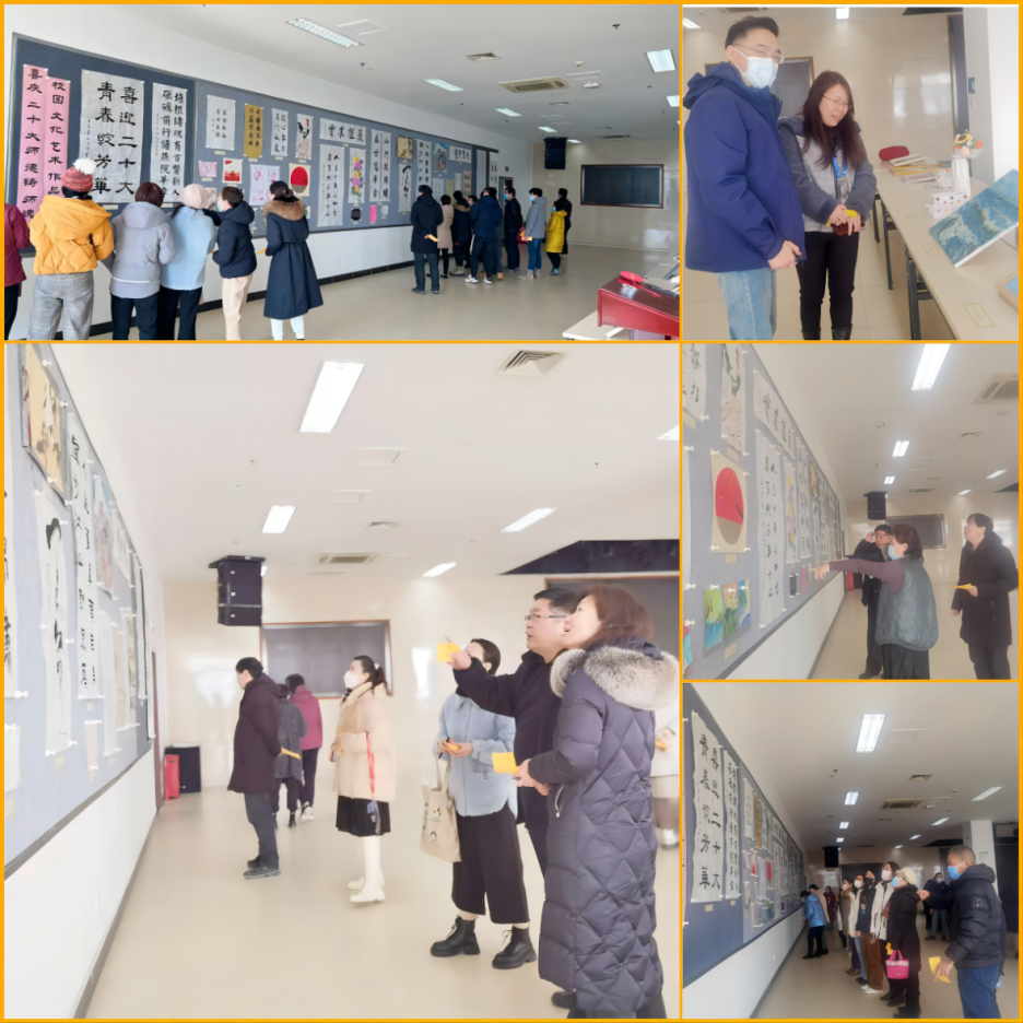 举办艺术作品展是我院文化建设的一项传统项目,迄今已连续举办了17届,在学院文化建设中发挥着重要的作用。本次活动围绕“喜庆二十大,师德铸师魂”的主题向师生征集参展作品,师生反响热烈,各施其能,各展其技,积极踊跃投稿,共征集到师生创作的作品百余件。此次展会展出了其中50余件优秀作品,作品种类丰富,呈现形式多样,包括书法、绘画、篆刻、剪纸、刺绣、手工等各类作品,吸引了千余名师生纷纷前来观赏学习,学院领导汤海新书记、杨红院长、赵艳芝副书记、崔群颖副院长、刘清副院长也第一时间亲自前往参观点评。