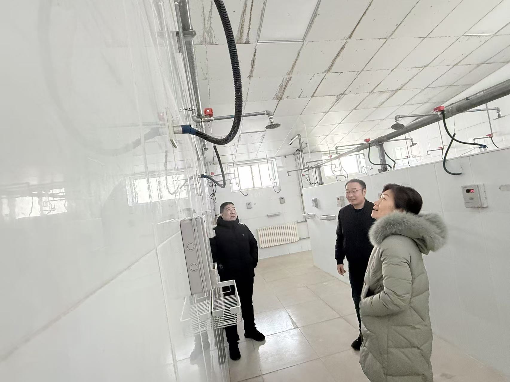 学院领导在学生浴室检查设备运行情况。