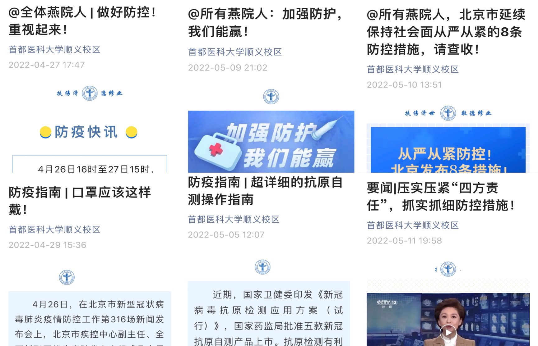 5月9日,顺义区突发聚集性疫情,首都防控形势严峻复杂,学院在学校领导的高度关注和关心指导下,坚持“预”字、未雨绸缪,第一时间快速响应,校园封闭,不进不出;坚持“快”字、快速溯源,最快速度排查掌握全部师生涉及疫情情况;坚持“责”字、有责必履,学院党委成员24小时轮流值守校园,靠前指挥。在疫情防控的严峻考验面前,学院党委严格落细意识形态工作责任制,强化落实单位责任、部门责任、个人责任;坚持“联”字、形成合力,通过公众号,钉钉工作群,微信群,发布疫情防控各项指令和工作指引,加强正面引领,加强关心关爱,师生同心协力,凝聚团结抗疫最大同心圆。