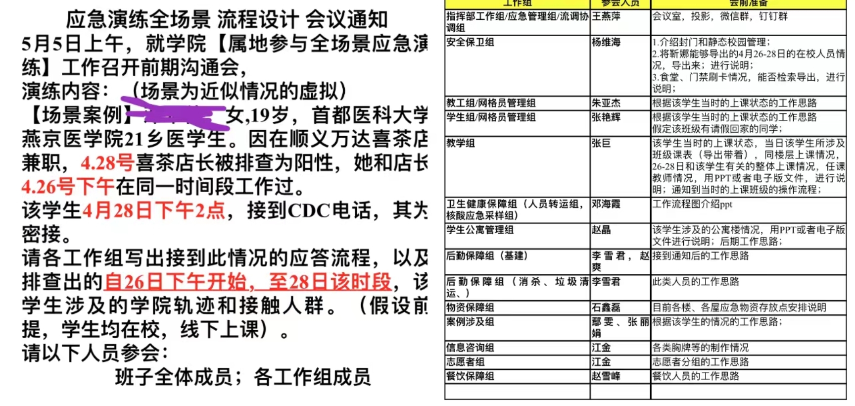 为切实提高疫情防控的有效性和针对性,5月5日,学院以某某学生作为密接且在校园为场景案例,组织疫情防控安全保卫组、教工组、学生组、卫生健康保障组、学生公寓管理组等各个小组结合案例分别进行全方位推演,参会人员围绕防疫消杀、物质保障等环节提出了细化的指导意见。