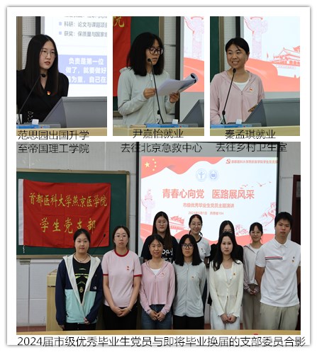 为激发学生党员更好地发挥先锋模范作用,营造优良校风、学风,同时协同推进就业育人工作,6月1日上午,学院学生党支部举办“青春心向党 医路展风采”2024届市级优秀毕业生党员主题演讲与分享交流会。学院全体学生党员、党员发展对象及部分入党积极分子和师生代表参加了此次活动。活动由学生党支部书记姜佳铃老师主持,7位获评2024届北京市优秀毕业生称号的学生党员依次做了演讲与分享交流。