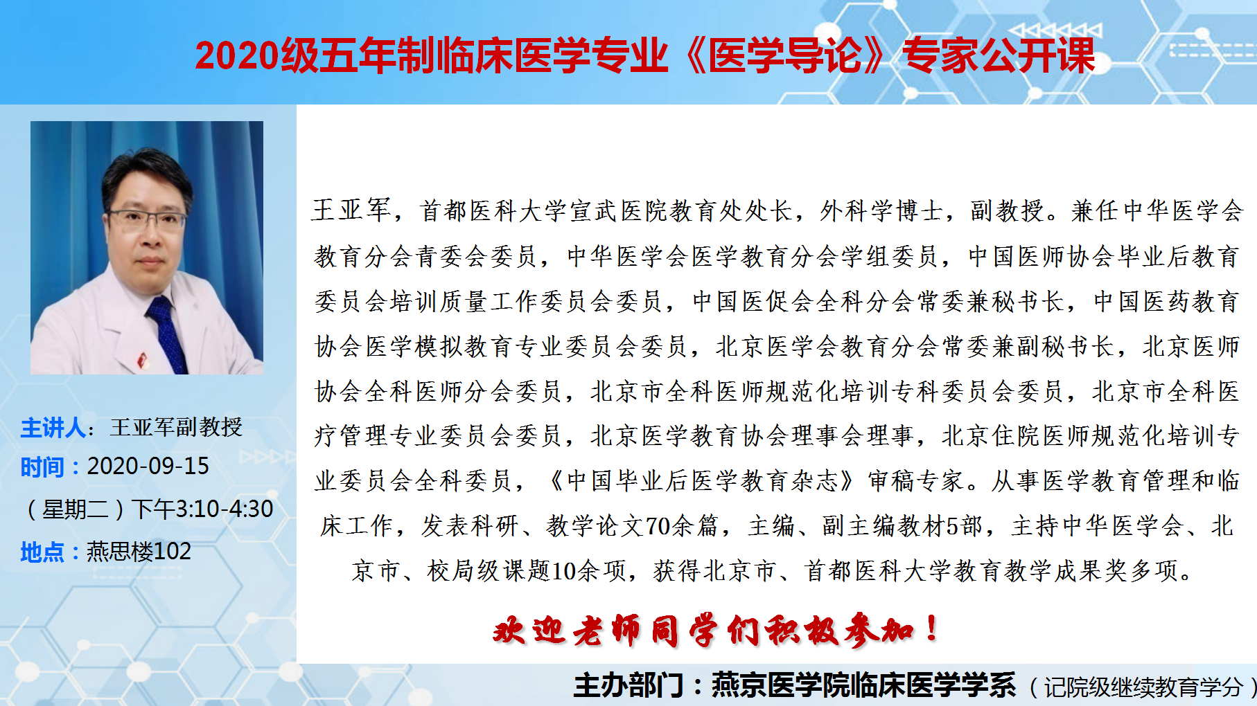 王亚军教授《医学导论》公开课的通知