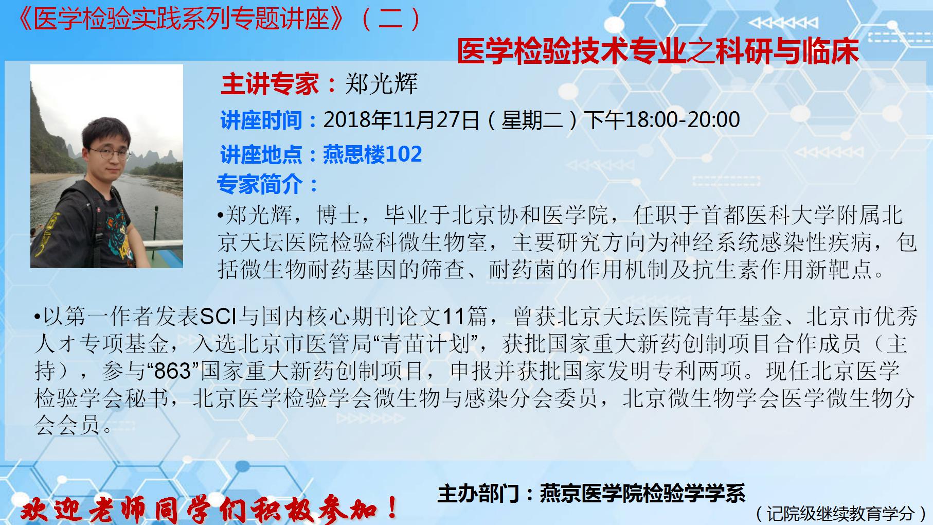 郑光辉 医学检验技术专业之科研与临床 讲座的通知